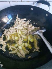 6.快速翻炒到肉变色,加盐少许,蒜片